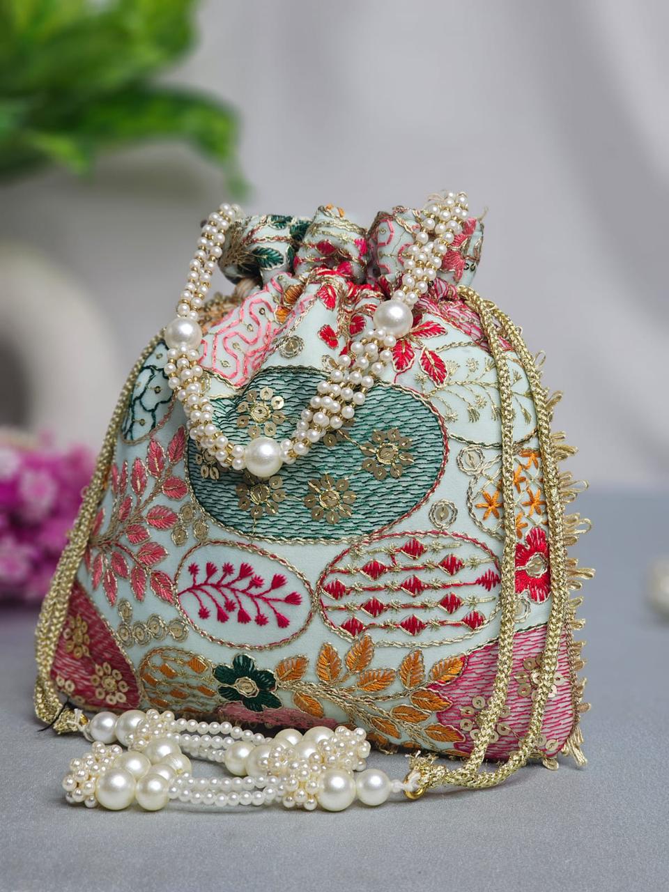 Celebrate the joy of gifting with our Aara Pearl Potli, a handcrafted blend of elegance and affordability. Designed on a cream base with vibrant embroidery and golden accents, this potli radiates festive charm. The highlight is its chic pearl-beaded handle that adds a touch of luxe sophistication without stretching your budget.