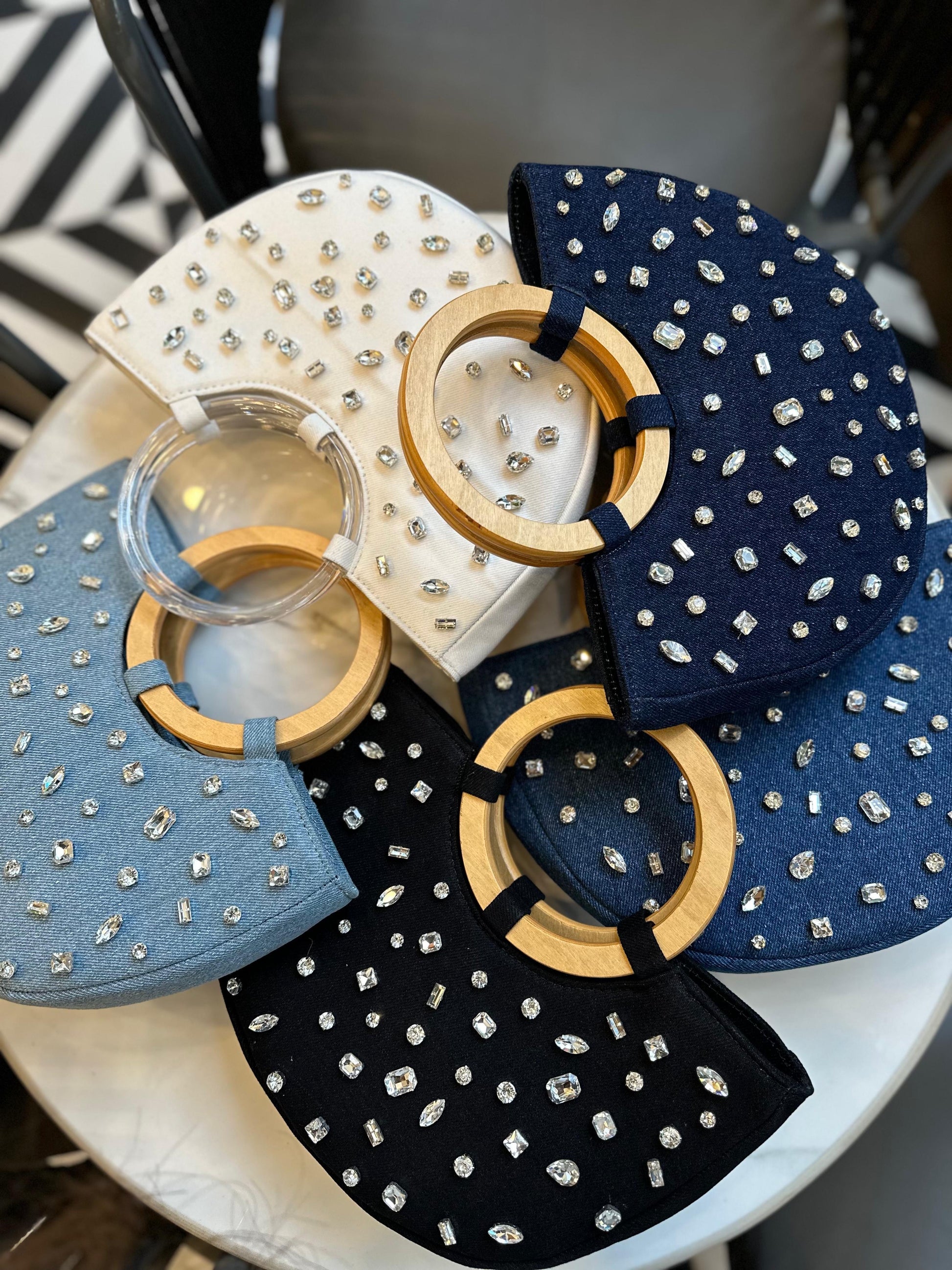 Elevate your accessory game with our stunning Crystal Crescent Denim Handbag with Wooden Handles, a true standout from our exclusive Denim Edit collection. This piece is a perfect fusion of natural elegance and sparkling glamour, designed for the woman who loves to express her individual style.