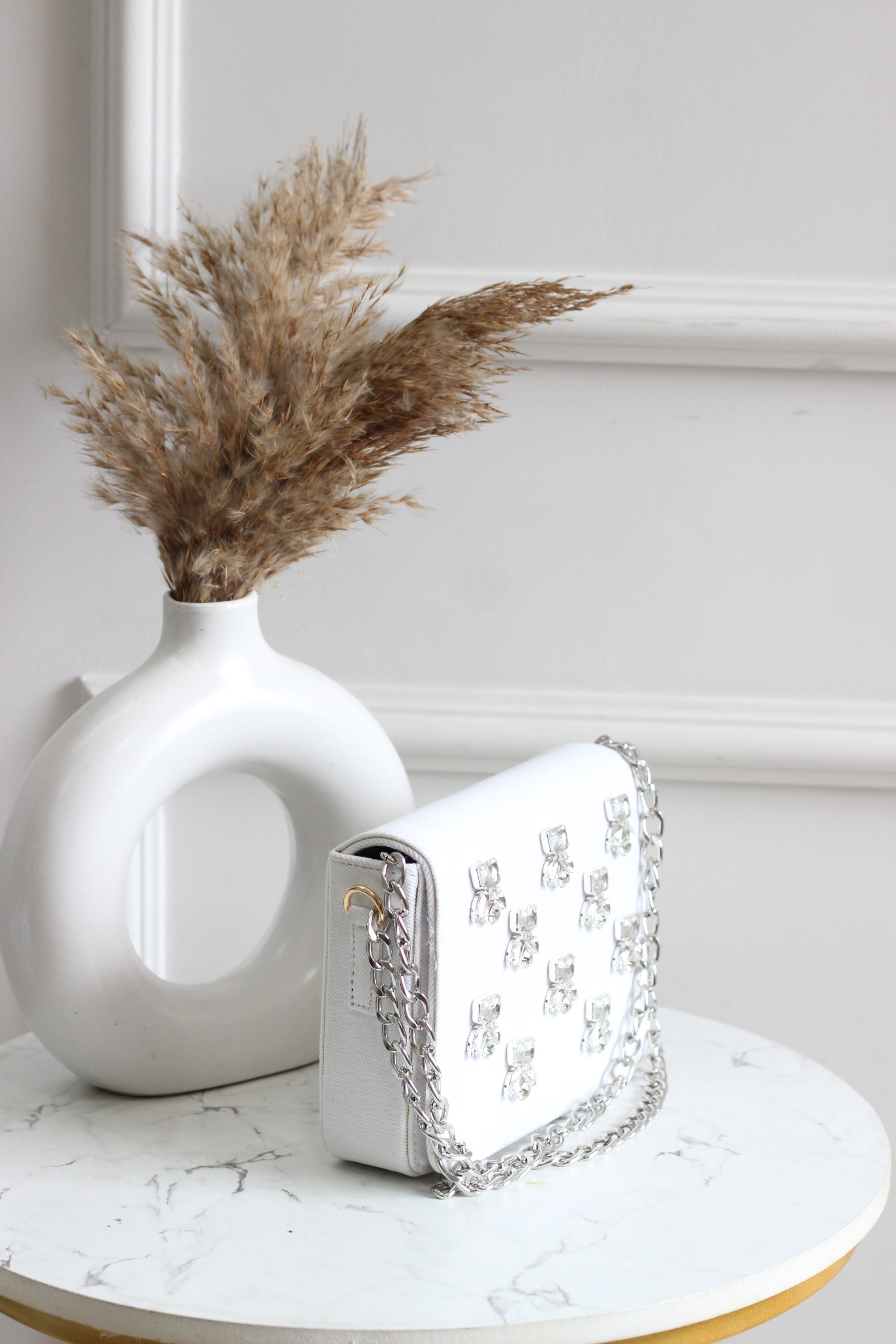 Rich Dark Denim: The deep color of the denim provides a striking contrast to the brilliance of the crystals, making the details stand out beautifully and giving the bag a luxurious feel.