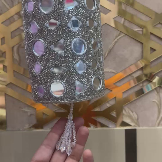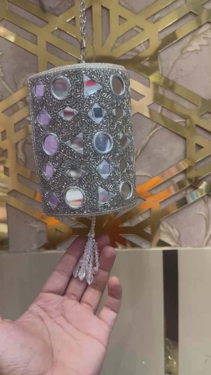 Radiate glamour with the Eleora Mirror Bag — a stunning statement clutch available in both gold and silver. Intricately hand-embroidered with cutdana and mirror work, this versatile piece is designed to reflect light and attention at every turn. Perfect for festive celebrations, wedding functions, and elegant gifting.