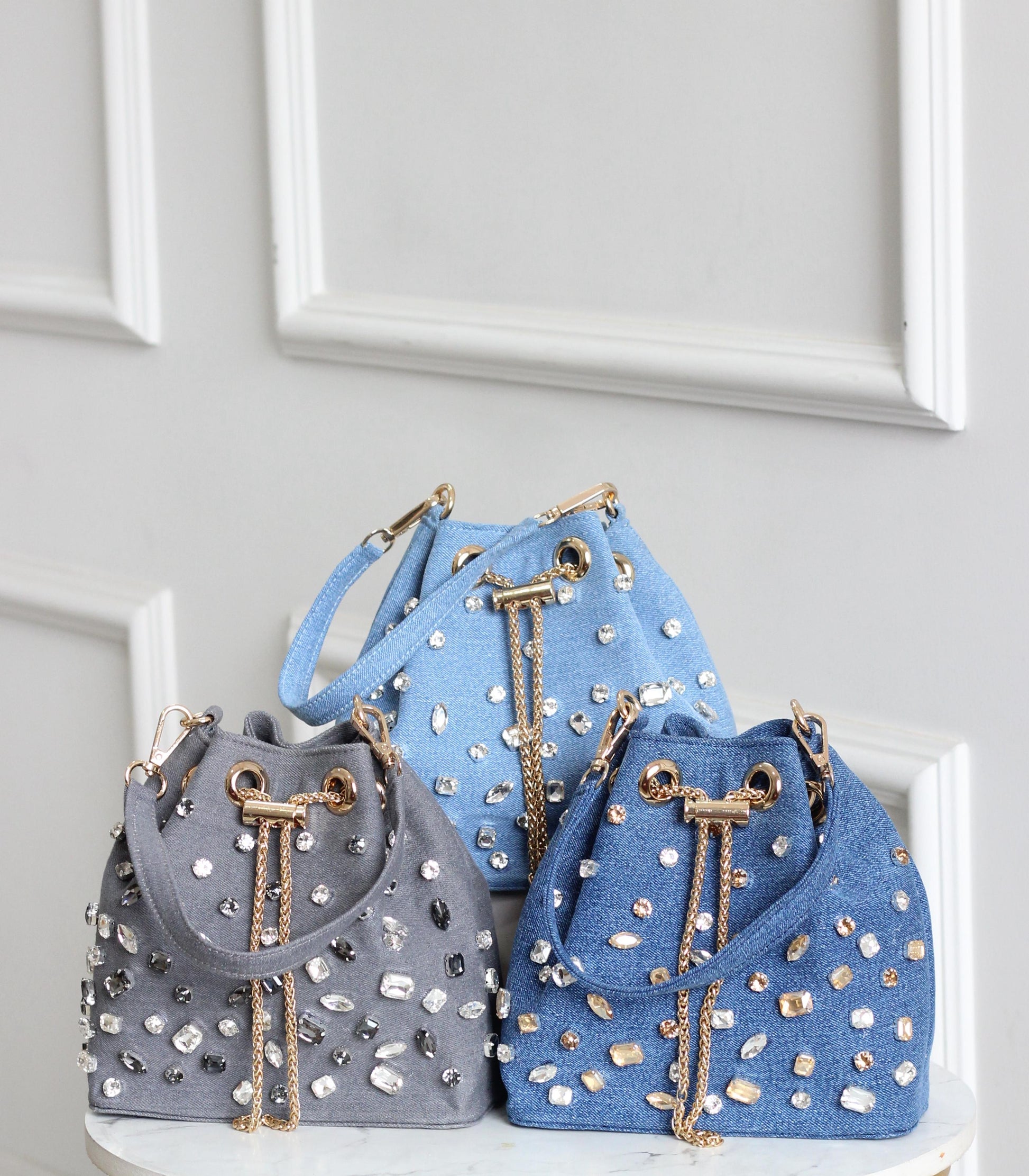 Elevate your style with our exquisite handmade Glimmering Denim Stone Bucket Bag, a must-have from our exclusive Denim Edit collection. Perfectly blending casual chic with sparkling sophistication, this unique handbag is designed to turn heads and add a touch of glamour to any outfit.