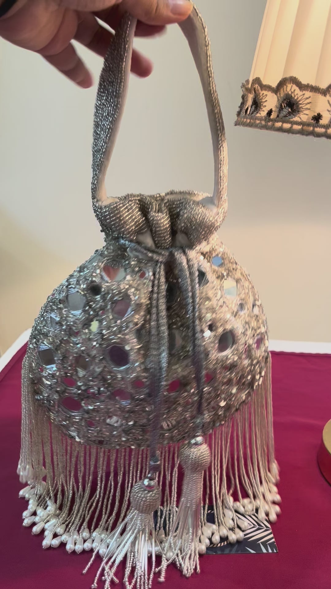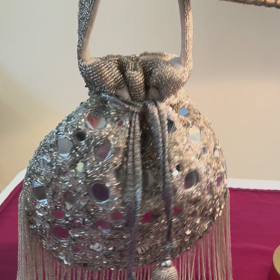 The Vehlina Mirror Potli is a luminous blend of elegance and artisanal flair. Adorned with carefully placed statement mirrors and detailed handwork, this potli captures light—and attention—with every movement. A perfect companion for bridal ensembles or festive wear, it adds traditional sparkle with a modern touch.